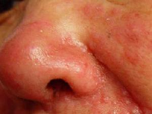 病期时间较长者,鼻部可出现多个结节,互相融合,表面凹凸不平,鼻部肥大,毛孔明显扩大,毛细血管显着扩张,纵横交错,形成鼻赘。