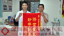 康复后,蒋先生特意送来一面锦旗并激动地说:“这几年就没能好好过个冬天了,一到秋冬季节就开始害怕,那难以忍受的瘙痒,痒到极致时,恨不得把皮肤抓破,可是得忍着,在这里治疗好银屑病后,2010年冬天,终于踏踏实实的度过了,过年时跟小孙子外孙女闹在一起玩,闲暇时又与老友厮杀在棋盘上。是你们新兴医院的专家让我迎来了明天!”