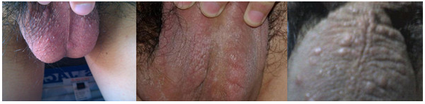 (1)小丘疹、疱疹和小水疱阴囊部可发现密集分布的小米大小的丘疱疹或小水疱,基底潮红。