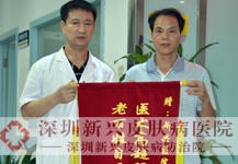 看到记者,蒋先生表现的很坦然,他说自己以前是个银屑病患者,看过很多地方,吃过很多药都没见效,没想到深圳新兴皮肤病专科专家沈朝禄主任把他多年的老毛病给治好了,他心里对沈主任非常感激,于是便带着锦旗冒着雨来到医院。