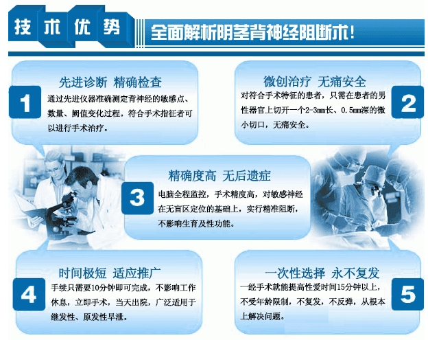 临床证明,采用“阴茎背敏感神经阻断术” ,弥补了传统在治疗原发性、顽固性早泄的手术空白。它能有效针对病因,将心理治疗与医学治疗相结合,药物与物理相结合,灵活辨证、科学有序、疗效显着,成为目前治疗早泄的首选技术。