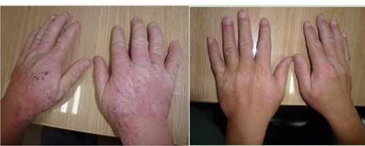 患病症状:患者自述于2013年5月外伤后双手部起红斑、丘疹,伴瘙痒,因搔抓后出现糜烂、淡黄色渗液。后来皮损扩展至手臂部、大腿、头皮,四 肢。近日,患者病情较前加重,躯干、手部起较多红斑、丘疹,自觉 瘙痒剧烈,搔抓后出现较多淡黄色渗液。尤以晚间加剧,严重影响睡眠。