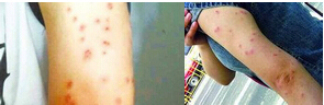 蠓虫叮咬后局部发生瘀点和黄豆大小的风团,奇痒,个别发生水疱,甚至导致丘疹性荨麻疹。