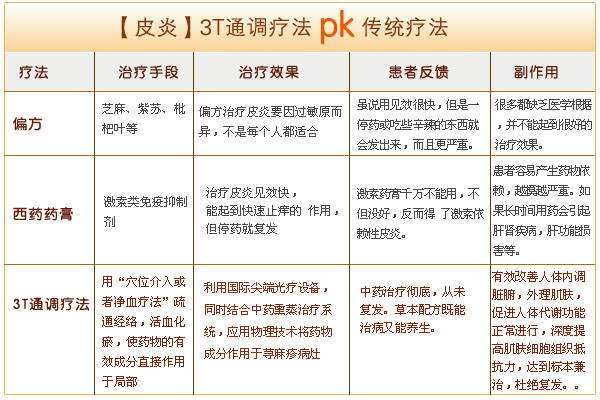 “3T通调疗法”根据中医“病在肌肤,根在血液,治血必治脏”的理论,采用医外治法(穴位介入、净血疗法)、免疫调节系统和中药熏蒸法完美融合的中医治疗理念,采用现代生物工程技术与中医的草本化和西医的现代化联合应用。针对各种不同原因所致的,皮炎、湿疹、荨麻疹,采用个性化临床治疗方案,可以彻底治疗各种,皮炎、湿疹、荨麻疹。