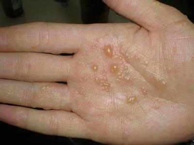 现今已经证实它和汗腺、流汗这些因素都没有关联。其临床表现为深在性小水疱,粟粒至米粒大小,略高出皮肤表面,常无红晕。对称发生于掌跖及指(趾)侧。1-2周后干涸成屑,并可反复发生,伴不同程度的灼热及瘙痒,常连续发作数年。