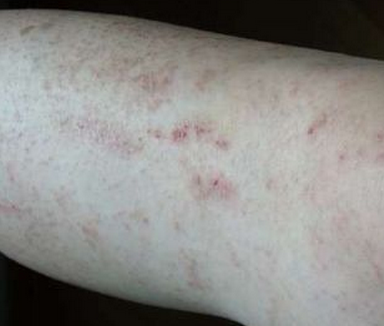 2、亚急性湿疹:急性湿疹炎症减轻后,仍有剧烈瘙痒,皮损以丘疹、结痂和鳞屑为主,可见少量丘疱疹,轻度糜烂。治疗恰当数周内可治好,处理不当,则可急性发作或转为慢性湿疹。