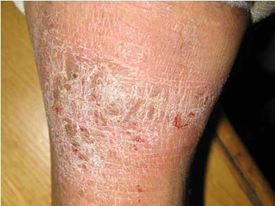 4、小腿湿疹:好发胫前及踝部。常由于下肢静脉曲张或外伤引起。结痂、增厚苔藓化,也可呈糜烂、流水,易继发感染或形成溃疡,顽固难治。