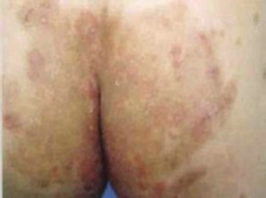 股癣是好发于股部的皮肤病,有时还可累及会阴、阴阜部、肛周、臀部等处。主要症状表现为瘙痒剧烈。由于搔抓,患者可继发皮炎、苔癣化改变或继发感染。股癣的皮疹是很有特点的,其特征为:股癣刚开始时,为边缘清晰、稍微隆起的红斑,渐渐扩大,上面有落屑,渐渐由红色转为褐色或肤色。病损的中心渐渐自动愈合,向周围发展,红斑的边缘炎症比较明显,上面有一些小疱、痂皮,甚至糜烂,形成环形。