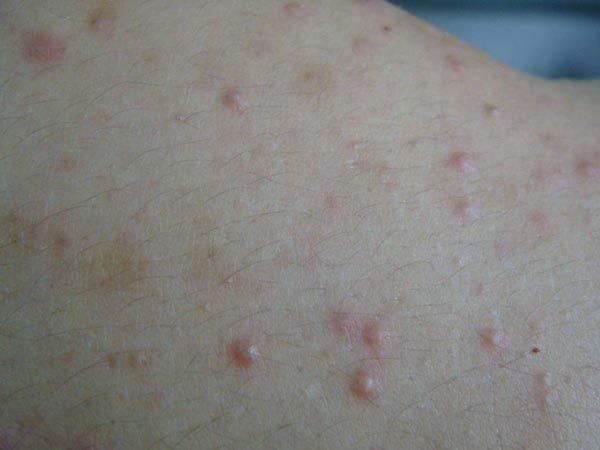 螨虫皮炎症状及图片。凡因螨虫叮咬而引起的皮炎统称螨虫皮炎。因该病多发生在秋收季节接触谷物的农民,故又称谷痒症,俗称“大麦痒”、“稻草痒”、“杂货痒”、“草痒症”、“荨麻疹样螨皮炎”、“蒲螨皮炎”等。螨皮炎好发于人体颈、胸腹、背及四肢皮肤,皮疹形态为蚕豆大水肿性鲜红色斑疹,中间有一小水疱(为螨虫叮咬痕迹),奇痒难忍,夜间尤甚。