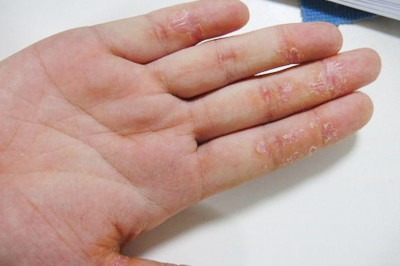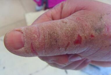 1.手部湿疹:发生于手掌部易浸润增厚,过度角化形成皲裂。手指端湿疹常反复发生水疱、结痂、增厚、脱屑,累及甲床部可影响指甲发育,致使甲板粗糙,凹陷不平。接触水、肥皂、洗衣粉等常使湿疹加重。