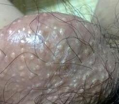 3、阴囊湿疹:急性红肿、溃烂、流水、结痂。慢性加厚、犹如层层苔癣。容易复发且奇痒无比。与人体汗液丰富、内分泌失调、外阴刺激等息息相关。