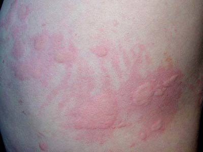 荨麻疹基本损害为皮肤出现风团。常先有皮肤瘙痒,随即出现风团,呈鲜红色或苍白色、皮肤色,少数患者有水肿性红斑。风团的大小和形态不一,发作时间不定。风团逐渐蔓延,融合成片,由于真皮乳头水肿,可见表皮毛囊口向下凹陷。风团持续数分钟至数小时,少数可延长至数天后消退,不留痕迹。皮疹反复成批发生,以傍晚发作者多见。风团常泛发,亦可局限。有时合并血管性水肿,偶尔风团表面形成大疱。