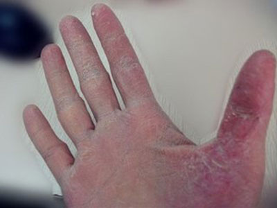 手癣皮损一般无明显的水疱或环形脱屑。掌面弥漫性发红增厚,皮纹加深,皮肤粗糙,干而有脱屑。冬季则常发生开裂,有时裂口很深伴出血,疼痛难忍,影响活动。促使手掌角化增厚的因素除皮肤癣菌外,还与长期搔抓、洗烫,肥皂、洗涤剂、各种化学物品和溶剂刺激以及不当治疗有关。