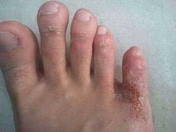 足癣,系真菌感染引起,其皮肤损害往往是先单侧(即单脚)发生,数周或数月后才感染到对侧。临床表现为脚趾间起水疱、脱皮或皮肤发白湿软,也可出现糜烂或皮肤增厚、粗糙、开裂,并可蔓延至足跖及边缘,剧痒。可伴局部化脓、红肿、疼痛,腹股沟淋巴结肿大,甚至形成小腿丹毒及蜂窝组织炎等继发感染。由于用手抓痒处,常传染至手而发生手癣(鹅掌风)。真菌在指(趾)甲上生长,则成甲癣(灰指甲)。真菌喜爱潮湿温暖的环境,夏季天热多汗,穿胶鞋、尼龙袜者更是为真菌提供了温床;冬季病情多好转,表现为皮肤开裂。